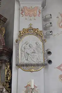 Die aus Holz geschnitzten Kreuzwegtafeln an den Wandpilastern und an der Rückwand unterhalb der Empore sind weiß gefasst und in vergoldete, neobarocke Rahmen eingesetzt. Ursprünglich waren die Relieffiguren farbig gefasst und die Tafeln von historisierenden Rahmen umgeben. Die Apostelleuchter an den Wandpilastern sind an aufwändig gestalteten Stuckornamenten mit Apostelkreuzen angebracht. Unter dem Chorbogen steht auf der rechten Seite der barocke Taufstein aus hellem Kalkstein, der mit einem modernen Kupferdeckel ausgestattet ist. Darauf ist im Relief die Patroziniumsdarstellung der Taufe Jesu im Jordan zu sehen.[7]