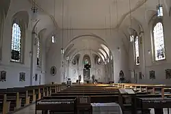 Das Langhaus ist an den Seiten leicht ausgebuchtet, hat eine Decke mit Spiegelgewölbe ohne Stützen und ist nur sparsam verziert. Der lang gestreckte, polygonale Chor im Osten hat ein Tonnengewölbe mit Stichkappe. Dahinter befindet sich ein Chorumgang, rechts davon die Sakristei.