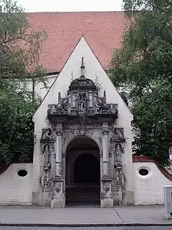Der Südeingang besitzt einen langgestreckten Vorbau mit einem verzierten Portal. Das Portal ist eine Steinmetzarbeit aus dem späten 19. Jahrhundert und stellt eine Kopie des manieristischen Kirchenportals des Klosters Tückelhausen dar. Der Einbau in die neue Kirche war eine Bedingung des Architektenwettbewerbs und die stilistischen Unterschiede zwischen dem Portal und dem restlichen Kirchbau begründen wohl den langgestreckten Vorbau.