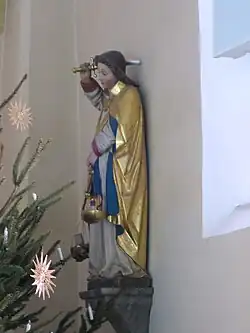 An der Südwand des Chorraums befindet sich eine Figur des Kirchenpatrons St. Michael mit Waage und Schwert. In der schwereren Waagenschale liegt ein Mühlstein. Ein Teufel klammert sich unten an die Schale. In der leichteren Schale sitzt ein betender Mensch. Die Figur stammt vermutlich aus dem 18. Jahrhundert.[1]