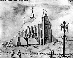 Unter einem einheitlichen steilen Satteldach sind ein gotisches doppelschiffiges dreijochiges Langhaus und (besonders für die Konventmitglieder) ein ebenfalls dreijochiger Langchor vereint. Ein nördliches Seitenschiff ist mit vier Zeltdächern gedeckt, zwischen die die Strebepfeiler der Obergadenmauer gelehnt sind. Diese sind im Chorbereich deutlich höher über die Dachtraufe geführt. Zuerst war das Dach an beiden Enden mit einem Johanniterkreuz und in der Mitte mit einem hohen gotischen Dachreiter bekrönt, der zu Finkenbaums Zeit durch einen Dachreiter mit Zwiebeltürmchendach und Johanniterkreuz ersetzt war. In der unter der Haube zu sehenden offenen Laterne waren wohl Glocken aufgehängt. Zu dieser Zeit ist der Westfront auch ein sechseckiger Treppenturm vorgesetzt.