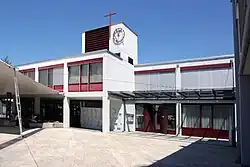 Über eine Treppe gelangt man von der tiefer gelegenen Huebwiesenstrasse auf den in den 1970er Jahren neu geschaffenen Gemeindeplatz, um den sich die Ämter der politischen Gemeinde, die Post, ein Hotel, ein Hallenbad, eine Bank sowie verschiedene Einkaufsmöglichkeiten gruppieren. Inmitten dieses Zentrums befindet sich die katholische Kirche St. Johannes. Dass es sich bei diesem schlichten Betonbau um ein kirchliches Zentrum handelt, ist nicht offensichtlich, da die Kirche optisch an die anderen Bauten um den Dorfplatz angeglichen worden war. Ein Dachreiter, in dem sich die drei Glocken der Kirche St. Johannes befinden und an den eine Turmuhr sowie ein schlichtes Metallkreuz angebracht wurden, verweist auf die kirchliche Nutzung des Gebäudes. Das dreistimmige Geläut wurde von Emil Eschmann, Rickenbach TG im Jahr 1972 gegossen und erklingt in der Tonfolge fis, a, h. Neben dem Eingang befindet sich an der Betonwand eine reliefartige Inschrift: „Johannes der Täufer“. Durch ein Foyer gelangt der Besucher in die eigentliche Kirche St. Johannes.