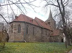 Zahlreiche Grabdenkmäler und Epitaphe der Familie von Rockhausen sind erhalten, darunter drei feingearbeitete figürliche Kindergrabsteine in der nördlichen Vorhalle, vermutlich alle von 1597. Beachtenswert ist auch der Grabstein des Freiherrn Antonius Friedrich von Rockhausen († 1672) mit einer Darstellung des Verstorbenen als gerüstete Figur. Das Epitaph der Hedwig Elisabeth von Rockhausen († 1672) zeigt die Verstorbene kniend vor dem Kruzifix mit einer Knorpelwerkkartusche und der Vita im Aufsatz. Das Epitaph für Levin von Rockhausen († 1673) und für Hans Caspar von Rockhausen († 1712) zeigt Bildnismedaillons in reich geschnitzter Trophäenrahmung. Eine große Bronzeglocke wurde 1604 von Herman Konigk aus Erfurt geschaffen, Eine kleine Bronzeglocke von Johann Georg Plabert aus Erfurt stammt aus dem Jahr 1686. Außen ist das Grabmal des M. Chr. Ottens († 1762) mit einem Aufsatz trauernder Frauen über einer Schrifttafel erhalten.