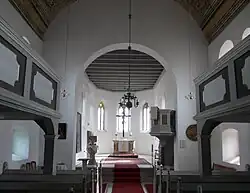 Im Innern gliedert der romanische Triumphbogen den Raum, eine rundbogige Pforte führt vom Chor zur südlich angebauten Sakristei. Das Schiff ist mit einer Holztonne überwölbt, auf dieser ist in weiß-roter Farbigkeit die Verklärung Christi dargestellt, eingefasst von emblematischen Darstellungen; deren Farbigkeit ist in Weiß, Grau und Gold gehalten. Über dem Altar ist ein geschnitzter Kruzifixus vom Anfang des 16. Jahrhunderts angebracht.