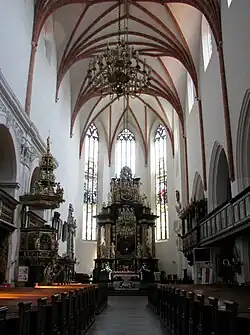 Der spätbarocke Altar ist mit marmorierten Platten und Akanthusblättern gestaltet. Er besteht aus Kiefernholz, Skulpturen und Ornamente sind aus Lindenholz gefertigt. Das Retabel zeigt das Letzte Abendmahl, die Grablegung und Auferstehung Jesu Christi und Christi Himmelfahrt. Es ragt 14,25 Meter hoch und ist fast sieben Meter breit. Die Kanzel, die von der Gestalt des hl. Christophorus getragen wird, schuf 1605 der Bildhauer Gerhard Hendrik.[3] In der Kirche befinden sich zahlreiche Grabmäler und Epitaphien. Die südliche Empore ist mit biblischen Malereien verziert, die 1597 bis 1603 geschaffen wurden und schließt mit der Fürstenloge. Die Glasfenster schuf Otto Linnemann aus Frankfurt.