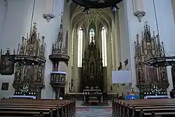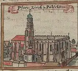 Die gegenwärtige Form des Bauwerks ergab sich durch Umbauten im Stil der Renaissance, des Barock und der Neugotik. Im 15. Jahrhundert wurde an der Südseite des Chors eine zweischiffige Kapelle angebaut, die der hl. Maria gewidmet ist. Die zweite Kapelle wurde im Barockstil 1701 während einer Pestepidemie als Gelübde an den hl. Rochus an die Nordvorhalle von 1562 angebaut. Der Querturm auf der Nordseite war nach seiner Vollendung im Jahr 1389 mit einem 120 Meter hohen Spitzhelm bekrönt; der gegenwärtige barocke Knickhelm ist 64 Meter hoch.