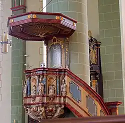 Die Kanzel gilt als eine der prächtigsten aus der Sasse-Werkstatt. Die farbenreiche Rokokofassung ist mit Gold abgesetzt. Der Kanzelkorb ist mit unter Baldachinen sitzenden Figuren der vier Evangelisten und stehend, der vier lateinischen Kirchenväter geschmückt. Die Evangelisten sind durch die beigegebenen Attribute erkennbar. Die Kirchenväter stehen, etwas vorgerückt, zwischen Säulen. Korb und Schalldeckel hängen an einer Säule, die von der Treppe umfasst wird. Der Kanzelboden ist mit Figurenreliefs verziert, die weibliche Karyatiden darstellen. Der Schalldeckel ist als flacher Schirm ausgearbeitet und nicht bekrönt. Der ursprüngliche Volutenaufbau ist nicht erhalten.