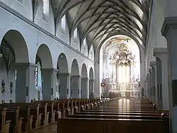 Die Deckenmalerei hat 1764 Franz Martin Kuen geschaffen. Zur Kirchenausstattung gehört ein Hochaltar aus Stuckmarmor, der 1763 von Johann Georg Dirr entworfen wurde. Das von Eustachius Gabriel gestaltete Altarretabel mit der Darstellung der Krönung Mariens wurde 1961 entfernt, um den Blick auf frühgotische Glasmalereien zu ermöglichen. Die Orgel wurde 2019 von Eduard Wiedenmann gebaut.[1]