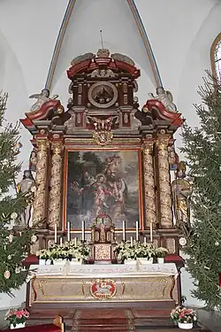 Der marmorne Taufstein ist ein Werk aus der Zeit um 1700. Die Kanzel aus Holz ist auf 1709 datiert. Ein Ölgemälde aus dem 17. Jahrhundert stellt die Heilige Familie mit Anna und Josephs Tod dar, zwei weitere die heilige Katharina (1702) und die heilige Apollonia (1710). Der Kreuzweg mit Ölbildern und Inschriften wurde 1775 von Stanislaus Stegmüller geschaffen. Mehrere hölzerne Figuren zeigen eine Doppelmadonna, die Immaculata und den heiligen Johannes Baptist (18. Jahrhundert) sowie die Unterweisung Mariens, den heiligen Johanns Nepomuk und die heilige Barbara (20. Jahrhundert).[1] Ein silbervergoldeter Kelch mit Edelsteinen und Emailmedaillons wurde im 18. Jahrhundert gearbeitet.