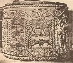 - Der romanische Taufstein ist wohl von der ersten Hälfte des 12. Jahrhunderts. Die Wandung ist vollkommen reliefiert. Die Darstellung der Engelsgestalten wirkt ungelenk. In stark schematisierter Ornamentik sind noch das Agnus Dei mit Kreuz und Fisch sowie Vögel dargestellt.