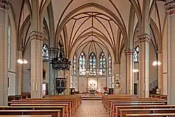 Von der neugotischen Erstausstattung sind die figurenreichen Buntglasfenster erhalten. Altar, Ambo und Tabernakel wurden in der zweiten Hälfte des 20. Jahrhunderts nach den Vorgaben der Liturgiereform angefertigt. Barock ist die Kanzel, die aus dem aufgehobenen Kreuzherren-Kloster in Düsseldorf stammt. Das Vortragekreuz, welches in der Apsis steht, stammt aus dem 13. Jahrhundert. Es befand sich zunächst in der vorreformatorischen katholischen Kirche, welche im Zuge der Reformation protestantisch wurde und an der Stelle der heutigen evangelischen Kirche stand. Im Jahre 1811 gab die evangelische Gemeinde das Kreuz zur Einweihung der Kirche am Johannisberg der katholischen Gemeinde wieder zurück.[2]