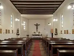 Der Innenraum wird von einer Flachdecke abgeschlossen. Das Kirchengestühl lässt einen Mittelgang frei und bietet 108 Sitzplätze. Der Hochaltar, die Kommunionbank, das Taufbecken und die Statuen gehören noch zu ursprünglichen Ausstattung der Kirche. Nach der Liturgiereform des Zweiten Vatikanischen Konzils wurde die Ausstattung um einen freistehenden Volksaltar ergänzt. Der Altarraum wird von einem Kruzifix dominiert. Neben dem Altarraum stellen Statuen Johannes den Täufer, den Schutzpatron der Kirche, und Maria, die Mutter Jesu, dar. Johannes verweist mit seiner rechten Hand auf den gekreuzigten Jesus. Die Buntglasfenster wurden von A. Reisdorff aus Köln entworfen und von der ebenfalls in Köln ansässigen Glasmalerei Botz + Miesen ausgeführt.[8] 14 Kreuzwegstationen befinden sich an den Seitenwänden der Kirche. Unter der Orgelempore befinden sich der Beichtstuhl, der Taufstein, sowie eine Kopie des Gnadenbildes Unserer Lieben Frau von der immerwährenden Hilfe, vor dem Opferkerzen aufgestellt werden können. Auf der Orgelempore befindet sich eine elektronische Orgel.