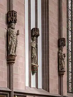 - Figurenzyklus mit Christus, Maria und den Aposteln Johannes, Judas Thaddäus, Simon Zelotes, Jakobus dem Älteren und Petrus vom Ende des 13. bis Mitte 14. Jh. im hohen Chor. Insbesondere die um 1380 entstandene Johannesfigur gilt als ein gutes Beispiel für den hochgotischen „schönen Stil“ und wurde 1978 für die große Parler-Ausstellung in Köln ausgeliehen.[8]