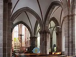 Der heutige Chorraum liegt drei Stufen höher als das Hauptschiff, hat eine Länge von zwei Jochen mit einem anschließenden Fünfachtelschluss und fast die doppelte Höhe des Hauptschiffes. Er ist ausschließlich aus Werksandstein hergestellt. Die Wandflächen enthalten hohe, drei- bis vierbahnige Maßwerkfenster und sind von außen durch hohe Strebepfeiler verstärkt. Die Gewölberippen sind durch Wandvorlagen hinuntergeführt und werden durch Baldachine, Statuen und Konsolen unterbrochen. Nach einer Inschrift am äußeren Chorschluss wurde dieser um 1366 gegründet. Wie offene Mauerverzahnungen außen und die nicht fertiggestellten Bündelpfeiler am Übergang zum Hauptschiff zeigen, sollte dem Chor offenbar auch eine hochgotische Erneuerung des Langhauses folgen. Nördlich des neuen Chores schließt sich eine zweijochige ehemalige Sakristei an, so dass die Chorfenster an der Seite nur als Blenden ausgeführt sind.