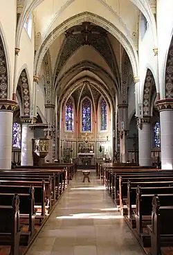 Das Kirchengebäude wurde im Stil der Neugotik als dreischiffige Basilika errichtet. Das Langhaus, mit vorangestelltem Kirchturm mit Spitzhelm, unterteilt in ein Mittelschiff und zwei niedrigere Seitenschiffe, weist eine Unterteilung in vier Joche auf. An das Langhaus schließt sich ein Querschiff an, daran ein fünfseitiger Chor mit polygonalem Abschluss. Als Grundriss ergibt sich somit die Form eines Lateinischen Kreuzes. Die Decken der drei Schiffe werden von Kreuzrippengewölben geformt. Die Decke der Vierung, der Stelle, an der Mittel- und Querschiff zusammentreffen weist ein Sterngewölbe auf.