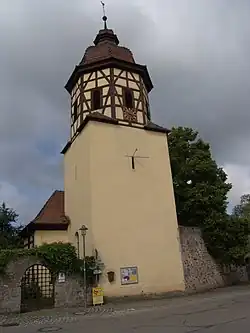 Der Chorturm der Saalkirche ist im Kern spätromanisch. Im 18. Jahrhundert wurde an ihn nach Westen das Langhaus mit einem südlichen Querarm angebaut. Außerdem wurde der Chorturm um ein Geschoss aus Holzfachwerk aufgestockt, das die Turmuhr und den Glockenstuhl beherbergt, und mit einer Zwiebelhaube bedeckt.