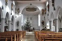Die Innenräume aller drei Kirchenschiffe sind, bis auf die östlichen Joche der beiden Seitenschiffe, die mit Kreuzgratgewölben bedeckt sind, seit dem Umbau im 18. Jahrhundert mit Flachdecken überspannt. Die Deckenmalerei im Mittelschiff ist die Kopie eines Originals von Giovanni Battista Tiepolo. An der Decke über dem Altar befindet sich ein Fresko von Linus Seif. In der Kirche befindet sich das Epitaph für Joachim von Sirgenstein. Die Orgel auf der oberen Empore wurde 1992 von Martin Gegenbauer errichtet.[1]