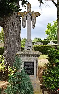 Ein schlichtes Kruzifix aus Sandstein stammt aus dem 18. Jahrhundert und entspricht dem Dreinageltypus. Eine Inschrift im Sockel lautet: „Gelobt sei Jesus Christus“. Darüber steht unterhalb des Kreuzes die trauernde Maria. Jesus am Kreuz wendet sich nach links. Südlich der Kirche befindet sich das Denkmal für die Gefallenen der Weltkriege.