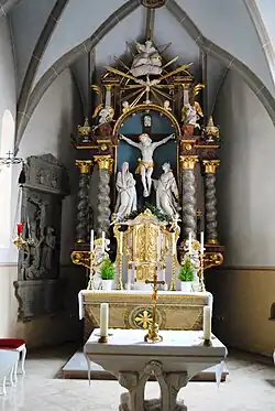 Der Hochaltar füllt die Ostwand des Chores aus. Er wurde um die Mitte des 18. Jahrhunderts geschaffen und mit der Anbringung der beiden Assistenzfiguren der Kreuzigungsgruppe fertiggestellt. Johann Peter Wagner schuf sie im Jahr 1789. Im Jahr 1788, hatte er bereits den Tabernakel des Altars geschaffen.[6] Der Altaraufbau ist viersäulig. Wie bereits sein Vorgänger des Jahres 1509 ist er dem Heiligen Kreuz geweiht.