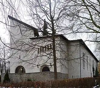 Die Saalkirche ist ein weiß verputzter Mauerwerksbau mit unsymmetrischem Satteldach. Der Dachfirst befindet sich nicht in der Mitte des Baukörpers, die Traufhöhen sind aber gleich. Nach Süden ist die Dachfläche stark geneigt und kurz, nach Norden schwach abfallend und lang. Die Seitenwände sind durch je fünf schlanke Paare von Rundbogenfenstern gegliedert. Der um mehrere Stufen erhöhte Chor schließt gerade. Er wird seitlich durch raumhohe Wandscheiben vom Kirchraum getrennt, sie erinnern an Stützen eines Triumphbogens. In der nördlichen Nische des Chors steht das Taufbecken, die Außenwand hat vier schmale hohe Rundbogenfenster. Eine Tür führt von der gegenüberliegende Nische, in der sich die Sedilien befinden, in die Sakristei. Der Anbau für die Sakristei ist vom Schleppdach des stark abfallenden Teils des Satteldachs bedeckt. Dem Chor gegenüber ist ein eingezogener Querriegel unter dem schwach geneigten Teil des Satteldaches vorgelagert, der den Vorraum zur Kirche beherbergt. Über dem rundbogigen Portal, das in den Vorraum der Kirche führt, befindet sich eine Reihe kleiner Rundbogenfenster. An der südöstlichen Ecke, unter einem Winkel von 45 Grad zwischen Kirchenschiff und Querriegel, springt auf rechteckigem Grundriss der mit einem Pultdach bedeckte Turm hervor, dessen Turmhalle mit zwei gegenüber liegenden rundbogigen offenen Portalen als Torbau konzipiert ist. Eine Tür führt von der Turmhalle in den Vorraum der Kirche.