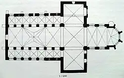 Der Innenraum ist vom Gegensatz zwischen den glatten, unprofilierten Formen der romanischen Arkaden und Vierungsbögen und den feingliedrigen, weit hinuntergezogenen Gewölben und vielteiligen Maßwerkfenstern des Chores geprägt. Die Raumwirkung wird maßgeblich von dem an der ursprünglichen Stelle in der Vierung erhaltenen Chorgestühl bestimmt. Im Langhaus stehen sieben schmale Rundbogenarkaden auf quadratischen Pfeilern. Die umlaufenden Kämpfer sind nur an den drei östlichen Pfeilern und an den flachen Vierungsvorlagen profiliert. Die Obergadenfenster des ursprünglich flach gedeckten, viel höheren Raumes sind nicht axial über den Arkaden angeordnet. Bei der Einwölbung im Osten und Westen wurden je zwei Arkaden und ein Fenster unter einem Kreuzrippengewölbe zusammengefasst. In der Mitte befindet sich ein drei Arkaden und zwei Fenster überspannendes Sterngewölbe.