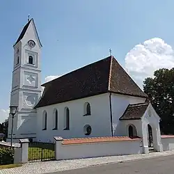 Die katholische Filialkirche St. Johannes Evangelist befindet sich im Spatzenhausener Gemeindeteil Hofheim, in der Nähe vom Nordwestufer des Riegsees.