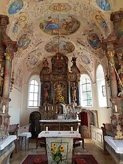 Im Innern ist das Langhaus flachgewölbt, die Deckenfresken stellen das Leben des heiligen Johannes des Täufers, der Propheten und von Adam und Eva dar. Die Altäre stammen aus der Frühphase (Hochaltar) und der Spätphase (Seitenaltäre) des Spätbarocks. Der Hochaltar im reich dekorierten Chorraum von 1694 wurde durch Martin Streicher erstellt. Die geschwungene Empore ist mit Fruchtgehängen und zwei Kreuzwegstationen ausgestattet.