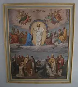 Die Deckenbilder im Chor stammen aus der Mitte des 18. Jahrhunderts. Sie stellen die Marienkrönung und die vier lateinischen Kirchenväter dar. Das Deckengemälde im Langhaus mit der Darstellung Jesu umgeben von Engeln und Heiligen wurde 1879 von Sebastian Wirsching ausgeführt.