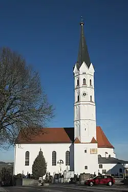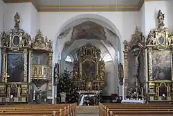 - Der Hochaltar mit seinen mächtigen Weinlaubsäulen wurde 1664 geschaffen. Die seitlichen Figuren aus der Zeit um 1740 stellen den heiligen Joseph (links) und Johannes Nepomuk (rechts) dar. Das Altarblatt wird sechs Mal im Jahr gewechselt. Es werden dem Kirchenjahr entsprechende Szenen präsentiert wie die Anbetung der Heiligen Drei Könige, ein Gemälde, das um 1630 datiert wird. Ein anderes Altarblatt ist mit Ignaz Fray 1808 bezeichnet und stellt in Anlehnung an das ursprüngliche, von Peter Paul Rubens gemalte Hauptaltarbild im Freisinger Dom Das apokalyptische Weib dar.
