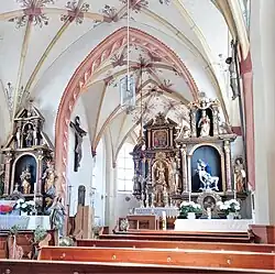 Der Innenraum des Langhauses ist mit einem Netzgewölbe überspannt, ebenso der des Chors. Der Hochaltar und der nördliche Seitenaltar mit einer Skulptur der Maria wurden um 1650 gebaut, der südliche Seitenaltar enthält eine Pietà von 1750. In der Nische des Hochaltars steht eine Statue Johannes des Evangelisten, erkennbar an seinem Attribut, dem Giftkelch, aus dem sich eine Schlage emporwindet.