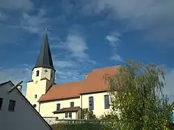 Die im Kern romanische Saalkirche wurde 1486 umgestaltet. Der Kirchturm auf quadratischem Grundriss wurde im 17. Jahrhundert im Westen des Langhauses angefügt. Sein oberstes achteckiges Geschoss beherbergt die Turmuhr und den Glockenstuhl. Darauf sitzt ein spitzer Helm. Der Chor im Osten wurde 1980–82 beträchtlich erweitert. Er ist dreiseitig abgeschlossen.