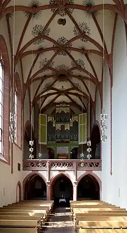 Das reiche Netzgewölbe aus dem Jahr 1516 ruht auf dünnen, der Wand vorgelagerten Diensten. Es ist zwischen den Gewölberippen mit gotischen Fresken in Form von Strahlkränzen und Blattwerk geschmückt. Die dünnen Dienste führen im Langhaus bis unterhalb der Fensterbänke, wo sie mit in einer glatten Schräge abschließen. Im Chorraum hingegen führen sie bis auf einen Sockel herab, aber wirken auch hier nicht als Träger, sondern eher als Wandgliederung. Die Rippen kreuzen sich in der Kapitellzone, verlaufen in der Wand und sitzen somit nicht auf Konsolen oder Diensten. Der Gurtbogen spaltet sich nach dem ersten Drittel seine Gesamtlänge in zwei Arme, die jeder dem seitlich liegenden Schlussstein zustrebt. Durch die sich kreuzenden Rippen und den sich spaltenden Gurtbogen entsteht eine Reihe von Schnittpunkten, die das Netzgewölbe bilden. Die Schlusssteine sind mit Wappen und teilweise stilisiertem oder naturalistischem Rankenwerk geschmückt.