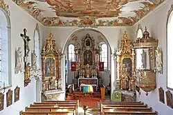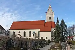 Die Saalkirche wurde um 1490 errichtet und jeweils in der 2. Hälfte des 17. und 18. Jahrhunderts verändert. Sie besteht aus einem Langhaus, einem eingezogenen Chor mit Fünfachtelschluss im Osten und einem Chorflankenturm an dessen Nordwand. Der Innenraum des Langhauses ist mit einer Flachdecke überspannt, der des Chors mit einem Stichkappengewölbe. Die um 1780 von Joseph Leitkrath gestalteten Fresken zeigen im Chor das Abendmahl Jesu und im Langhaus die Kreuzigung Christi. Das Altarretabel des 1910/11 gebauten Hochaltars hatte 1722 Andreas Bergmüller geschaffen. Eine um 1750 entstandene Kreuzigungsgruppe wird Peter Heel zugeschrieben. Die Orgel wurde 1997 von Rudolf Kubak gebaut.