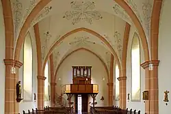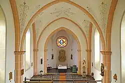 In der Turmhalle befinden sich eine Grabplatte und ein Epitaph-Fragment der Familie Cob von Nüdingen († 1671 und † 1699). Die Friedhofsmauer ist im Kern wohl noch mittelalterlich; Grabmal Clemens Wenzeslaus († 1840).