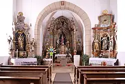 Die Ausstattung der Kirche stammt aus der Zeit zwischen 1648 und 1879. Der Hochaltar entstand um die Jahre 1760 bis 1770 in der Werkstatt des Kronacher Bildhauers Pankraz Fries.[3] Der linke Seitenaltar ist der Muttergottes und der rechte dem heiligen Josef gewidmet.