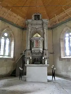 Der Saalbau weist eine barocke Innenausstattung aus der Zeit um 1720 auf. Der mit einer Hufeisenempore versehene Innenraum wird von einer flachen Holztonne überwölbt, deren Restaurierung im Jahre 2020 erfolgte. Im Aufsatz des mit korinthischen Säulen versehenen Kanzelaltars befindet sich ein Bild des Christuskopfes zwischen Akanthusranken.