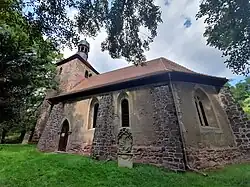Es handelt sich um einen einschiffigen Bau mit dreiseitigem Ostschluss und einem fast quadratischen Westquerturm, der 1716/17 um- und teilweise neu gebaut wurde, dessen Kern jedoch in der ersten Hälfte des 16. Jahrhunderts vermutet wird. Das Querwalmdach mit Dachreiter stammt aus der Zeit des Neubaus; die Stützpfeiler am Schiff aus dem 19. Jahrhundert.