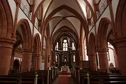 Die neugotische Kreuzbasilika besitzt einen dreiseitig geschlossenen Chor. Der Chor, die Vierung und die Seitenschiffe besitzen vierteilige, in Mittelschiff und den Querarmen sechsteilige Gewölbe.