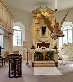 Die rechteckige, verputzte Saalkirche hat einen unregelmäßigen 5/8-Schluss des Chors unter einem abgewalmten Satteldach. Der Innenraum mit seiner U-förmigen Empore ist mit einer geputzten, hölzernen Flachdecke überspannt. Die Bogenfenster sind versprosst.