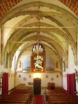 Das Kirchenschiff entstand in der zweiten Hälfte des 14. Jahrhunderts. Es befindet sich westlich des Kirchturms (der im Keller die Sakristei beherbergt) und ist vier Joche lang bzw. etwas höher und breiter als das Presbyterium. Seine Konstruktionselemente (Gewölberippe, Pilaster, Konsolen, Fensterrahmen) bestehen aus Kunststein. An den Konsolen gibt es prächtige Figuren- und Tierdekorationen: an der Nordwand ein Fuchs und Gänse, an der Südwand die Fütterung geschlüpfter Pelikan-Küken und Masken, umgeben von Laub. Auf dem Schlussstein der Gewölberippen sind drei Pilaster in Form eines Baldachins (der vierte Pilaster ist zerstört). Da, wo sich die Gewölberippen kreuzen, befinden sich zwei Knöpfe sowie Blumen mit einer doppelten Krone. Ansonsten schmücken zahlreiche Rosetten und fünfblättrige Blumen die Gewölberippen. Die fünf spitzbögischen Kirchenfenster entsprechen den typischen Merkmalen des gotischen Baustils. Das Kirchenportal zum Kirchenschiff ist auf der Südseite gotisch (mit verzierten Ziegeln) bzw. auf der Nordseite, erbaut im 17. Jahrhundert, barock. Die Tore der Sakristei zum Kirchenschiff sind aus Gusseisen, Reliquien einer alten Burg.