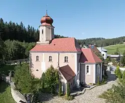 Die Kirche hat einen Chor von 1619 mit Spitzbogenfenstern in rundbogigen Fensternischen. Gegenüber der Kanzel befindet sich eine barocke Madonnenfigur. Auch die Altäre sind barock gestaltet. Der Turm an der Westfassade verjüngt sich zu einem Oktogon und schließt mit einer Turmzwiebel ab. Die Kirche ist von einer Friedhofsmauer umgeben, an der deutsche Grabsteine erhalten sind.