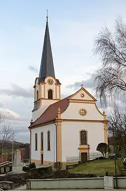 In ihrer heutigen Form entstanden die Kirche im Jahr 1794 unter Ortspfarrer Georg Stephan Behr, der nach seinem Amtsantritt im Jahr 1780 bereits für einen Wiederaufbau des Pfarrhauses gesorgt hatte. Im Jahr 1794 entstand das Langhaus der Kirche unter Maurermeister Valentin Schleichert aus Kissingen.