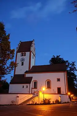 Die im Kern romanische Kirche ist ein verputzter Satteldachbau mit Kreuzgratgewölbe im Altarraum. Der gotische Chorturm ist mit einem Fries verziert und der Turmgiebel mit Bogenblenden und Aufsätzen gegliedert. Die Langhausflachdecke mit Rahmenstuck stammt, wie der Hauptaltar, aus der Zeit um 1730. Die Seitenaltäre wurden im 19. Jahrhundert geschaffen.