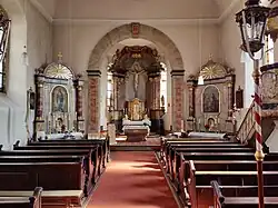 Der Hochaltar im Stil des Rokoko stammt aus der Kirche St. Michael in Würzburg. Er datiert aus dem Jahr 1775. Über dem Tabernakel befindet sich ein großes Kruzifix. Am rechten Seitenaltar sieht man ein Gemälde der Taufe Jesu im Jordan, am linken eines der Muttergottes. An der Kanzel, ebenfalls 1775 im Stil Materno Bossis gefertigt, befindet sich ein Relief der vier Evangelisten. In der Kirche sind auch spätgotische Holzfiguren der Heiligen Vitus und Nikolaus aus der Zeit um 1510 zu sehen.