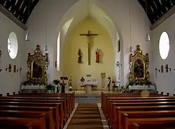 Im Inneren ist die Kirche mit zwei barocken Seitenaltären und weiteren spätbarocken Figuren ausgestattet. Der linke Seitenaltar stellt eine Kreuzwegstation dar, der rechte die Beweinung am Grab Christi. Im Altarraum hängt ein Kreuz Christi mit den Figuren der Mutter Maria und einem Evangelisten, dem Apostel Johannes. Weitere Figuren im Kircheninneren sind St. Johannes der Täufer, der Nährvater Josef und eine Apokalyptische Madonna mit Kind.