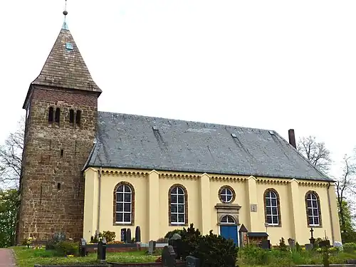 Der romanische Feldsteinturm mit seiner mittelalterlichen Verblendung aus Granitquadern wurde oberhalb der romanischen Schall-Biforien mit neuzeitlichem Backstein erneuert. Darüber erhebt sich ein Zeltdach. Das heutige Westportal aus Sandstein entstand beim Umbau der Kirche 1719 und hat Ähnlichkeit mit den beiden seitlichen Portalen des Kirchenschiffs. Über dem Türsturz aus Kalkstein hat es einen halbrunden Entlastungsbogen, der statt eines Tympanons ein schmuckloses Oberlicht umfasst. Die Gewände sind in einen angedeuteten Vorbau eingebettet, der statt mit einer Attika mit einem geschwungenen „Dach“ aus verputztem Mauerwerk schließt. Unregelmäßige Baufugen zeigen an, dass beim Einbau des Portals auch das umgebende Granitmauerwerk ausgetauscht wurde.