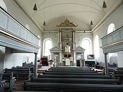 Der Kirchenraum ist rechteckig. Einziger Schmuck seiner Muldendecke sind sehr zarte Gurtbögen und einander kreuzende Rippen, die wohl an mittelalterliche kreuzrippen-- oder auch Kreuzgratgewölbe erinnern sollen. Abweichend von der Gliederung der Außenwände in fünf Felder und mit fünf Achsen, sind an der Decke nur vier Joche angedeutet. An der Ostwand steht ein Kanzelaltar mit einem Rokokogiebel, zu beiden Seiten gibt es Türen mit klassizistischen Attiken, von denen eine zur Sakristei führt. Eine Empore erstreckt sich an der Ostwand sowie an den Längswänden bis über die Seitenportale. Ein gedrückter Backsteinbogen verbindet den Kirchenraum mit dem Turm, dessen Granitmauerwerk auch innen großenteils freiliegt.