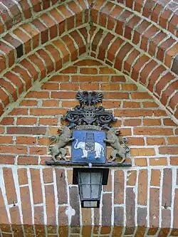Über dem spitzbogigen Eingang des Kirchturms weist das Wappen der Familie von Le Fort auf die Erbauer der Kirche hin.