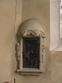 In der Ecke zwischen dem Turm und der nordöstlichen Chorschlussseite befindet sich ein Sakramentshäuschen das um 1515 datiert wird. Über der Rechtecknische tritt aus der Wand eine Kuppelhaube hervor. Neben der Nische stehen auf spitzen Konsolen zwei Statuen, die männliche Heilige mit einem Buch darstellen. Den Abschluss bildet ein schmiedeeisernes Nischentürchen mit einem Schieberiegelschloss.[1]
