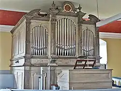 1746 wurde über dem Altar eine Orgel aufgestellt. 1902 ersetzte der Nürnberger Orgelbauer Johannes Strebel die Barockorgel. Das Instrument befindet sich auf der Westempore und hat zwei Manuale, Pedal sowie zwölf Register. Der Orgelprospekt besteht aus drei Rundfeldern. Das mittlere Feld ist höher und wird von zwei Säulen auf Volutenkonsolen eingerahmt. Den oberen Abschluss bilden Vasen. Auf den oberen Gesimsen sind seitlich Segmentgiebelschenkel und in der Mitte ein Rundbogengiebel aufgesetzt. Die Vorderfüllungen des Untergehäuses zeigen verkröpfte Rahmen.[3] 1999 wurde das Instrument von der Firma Hey restauriert.